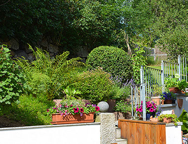 Zentral im Ort, aber doch sehr ruhig in einer kleinen Seitenstraße ( Sackgasse) an einem Südhang unterhalb des Marktplatzes.